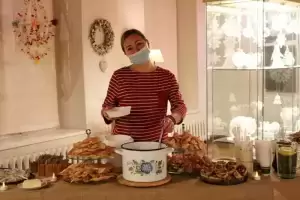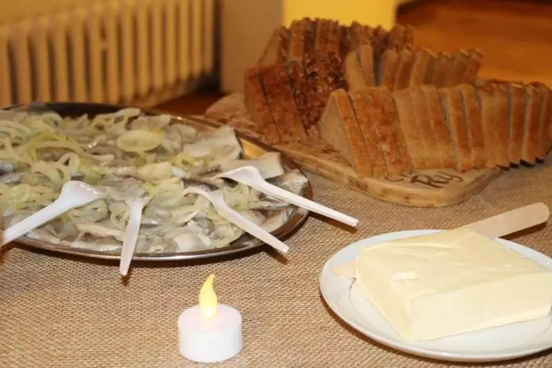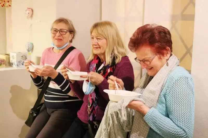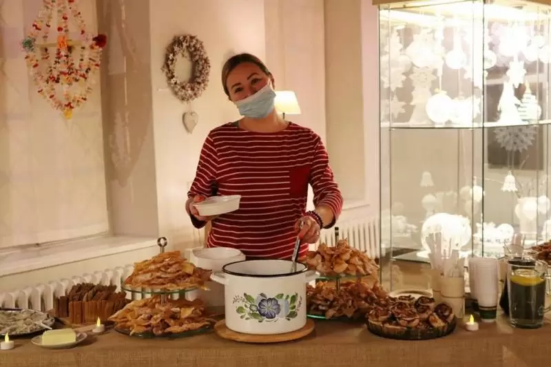 Po części teoretycznej gości zaproszono na zapustowy poczęstunek. Przygotowany stół prezentował się naprawdę wspaniale. Można była znaleźć na nim m.in. lane faworki, śledzie, róże z ciasta francuskiego, kaszę z boczkami oraz postny żurek z jajkami.