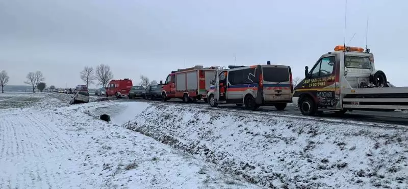 Dziś w związku z oblodzeniem dróg, przypominamy o zasadzie "śpiesz się powoli". Na drodze krajowej nr 5, podczas manewru wyprzedzania doszło do zderzenia 4 pojazdów.