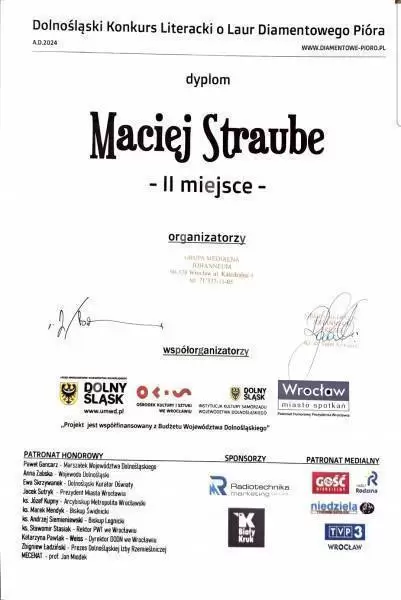W gminie Środa Śląska młodych talentów nie brakuje! Maciej Straube, uczeń Szkoły Podstawowej nr 3 w Środzie Śląskiej zdobył 2. miejsce w Dolnośląskim Konkursie Literackim o Laur Diamentowego Pióra. Serdecznie gratulujemy!