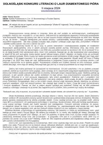 Jego mądre i ciekawe spostrzeżenia, umiejętność trafnego powoływania się na autorytety i sprawność językowa zyskały uznanie jury. Został zaproszony na uroczystą galę jako jeden z 36 finalistów, a tam dowiedział się, że tylko dwie spośród 150 prac dolnośląskich uczniów szkół podstawowych i ponadpodstawowych (!) były lepsze niż jego – tym samym zajął II miejsce!