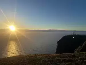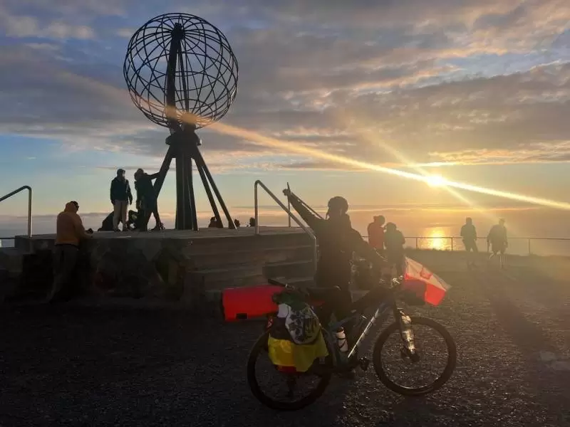 Po niespełna dwóch tygodniach, w środę 10 lipca, gdy licznik rowerowy przekroczył 1700 km, dotarłem do celu i rozbiłem namiot tuż obok charakterystycznego dla tego miejsca pomnika w kształcie globu. Silny wieczorny wiatr ustał dopiero koło północy. A ponieważ panuje tam polarny dzień i słońce nie zachodzi, wyszedłem na sesję zdjęciową. Zmęczony, ale szczęśliwy, że udało mi się spełnić kolejne marzenie.