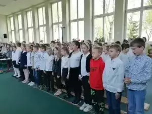 Święto Narodowe Trzeciego Maja uczniowie klas I - III Szkoły Podstawowej nr 3 w Środzie Śląskiej uczcili uroczystym apelem, który przygotowały klasy 1d i 2a pod kierunkiem swoich wychowawczyń. Apel rozpoczął się od wspólnego odśpiewania "Mazurka Dąbrowskiego".
