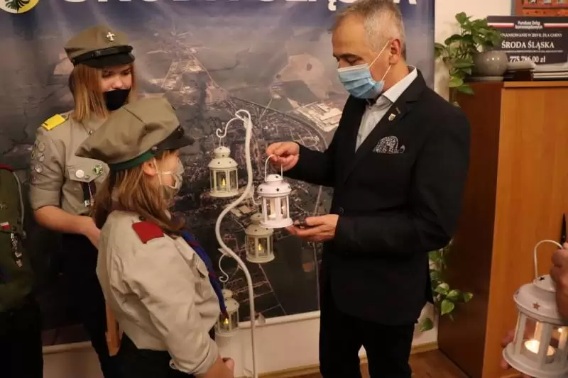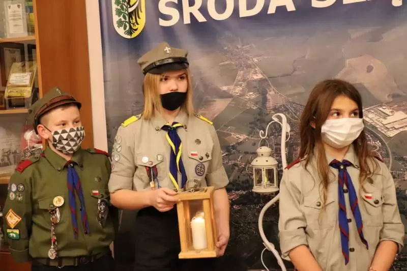 Przedstawicieli średzkiego samorządu z lampionem z płonącą w środku świecą, będącą symbolem Światła Pokoju odwiedzili harcerze z 13. Grunwaldzkiej Średzkiej Drużyny Harcerskiej „KRZESIWO” ORAZ 77. Grunwaldzkiej Średzkiej Drużyny Starszoharcerskiej „BUSOLA”: Szymon Bartoch, Emilia Barczyk, Maja Lachotkiewicz i Zofia Malczewska.
