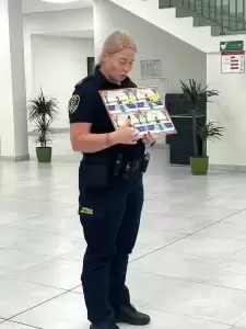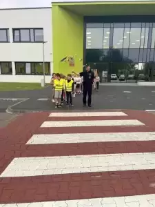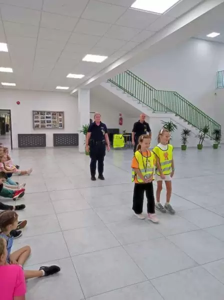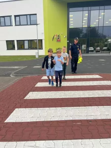 Uczestnicy mieli okazję nauczyć się, jak bezpiecznie przekraczać przejścia dla pieszych, unikać niebezpiecznych miejsc, takich jak zakręty czy wyjazdy z parkingów, oraz jak właściwie zachowywać się w sytuacjach zagrożenia. Dzięki aktywnemu uczestnictwu dzieci zyskały cenną wiedzę praktyczną i pewność siebie w poruszaniu się po drogach. Dodatkowo, pracownicy Straży Miejskiej pokazali dzieciom, jak działa sygnalizacja świetlna oraz jak rozpoznawać różne znaki drogowe. Wszyscy uczniowie z dużym zaangażowaniem brali udział w zadaniach a najmłodsi uczniowie otrzymali odblaskowy element, aby mogli być lepiej widoczni na drodze.