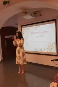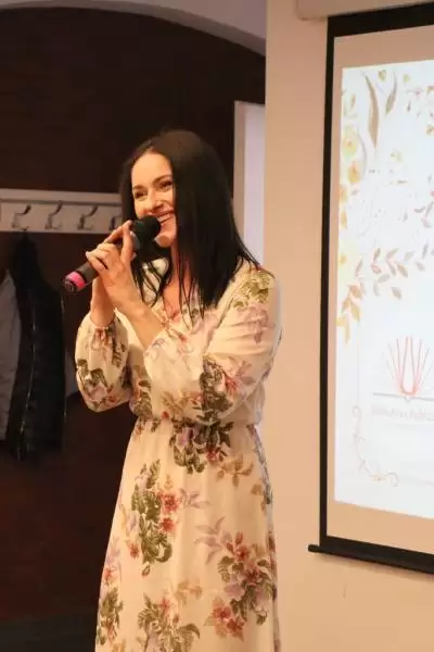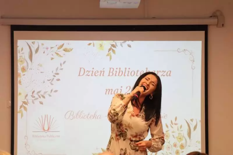 Gosia Pauka rozpoczęła swoim występem spotkanie, a Przewodniczący Rady Miejskiej Andrzej Bielski razem z Burmistrz Elżbietą Czarnotą, wręczyli Bibliotekarzom kwiaty oraz zaprosili na słodki poczęstunek.