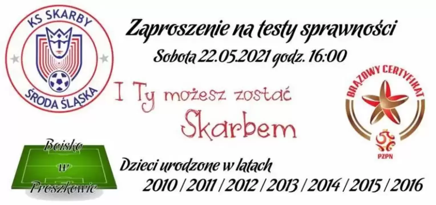 Testy odbędą się w godz. 16.00 - 19.00 na boisku w Proszkowie i są skierowane do najmłodszych, w wieku od 4 do 12 lat. - Opracował je Polski Związek Piłki Nożnej na bazie Programu Szkolenia Akademii Młodych Orłów - informuje Maciej Kogutek, organizator testów i trener jedynej na terenie powiatu certyfikowanej przez PZPN Szkółki Piłkarskiej.