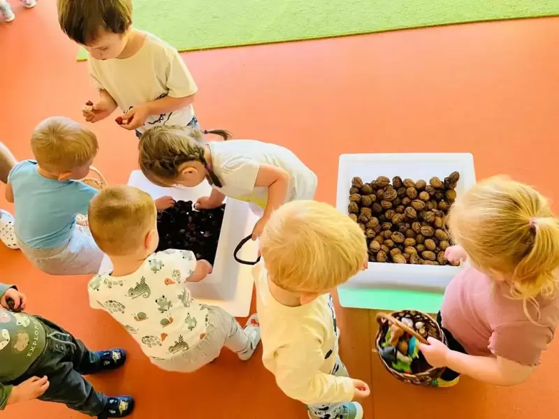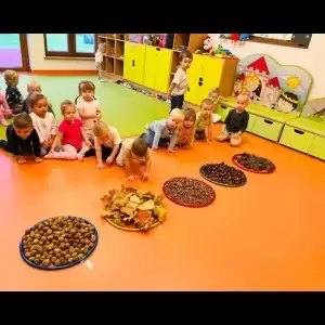 Przy użyciu kasztanów, orzechów, żołędzi, liści oraz szyszek, dzieci miały przygotowaną ścieżkę sensoryczną. Dużo radości sprawiła im również zabawa w odnajdywanie grzybków i zwierzątek ukrytych wśród orzechów i kasztanów znajdujących się w podświetlanych stolikach.