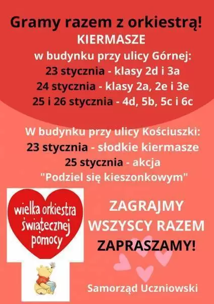 Szkoła Podstawowa nr 3 im. Władysława Broniewskiego w Środzie Śląskiej oraz Młodzieżowa Rada Miasta zapraszają na WOŚPowe kiermasze w budynku przy ul. Górnej, które przeprowadzą kolejno: 23 stycznia – klasy 2d i 3a, 24 stycznia – klasy 2a, 2e, 3e oraz 25 i 26 stycznia – 4d, b, 5c i 6e. Dodatkowo w budynku przy ul. Kościuszki, 23 stycznia odbędzie się słodki kiermasz, natomiast 25 stycznia - akcja „Podziel się kieszonkowym”. Kiermasze rozpoczynają się rano i trwają do 13:30 lub wyczerpania asortymentu.