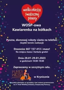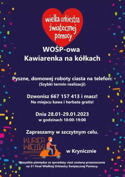 WOŚPowa kawiarenka na kółkach to nowość w Krynicznie! 28-29 stycznia w godz. 10:00-19:00 na terenie miejscowości będzie można zamówić pyszne, domowe ciasta z dostawą do domu, które w trybie niemal natychmiastowym dostarczy kurier wiejski. Jeśli jednak zamiast dostawy do domu wybierzecie się do świetlicy wiejskiej, w gratisie do ciasta otrzymacie kawę lub herbatę. 28 stycznia Kryniczno szykuje również zabawę karnawałową z dj. dla dzieci i dorosłych od godz. 15:00-18:00 (dzieci), godz. 20:00-02:00 (dorośli), natomiast 29 stycznia rajd rowerowy i ognisko. Dodatkowo 26 stycznia o godz. 19:00 w Sali świetlicy wiejskiej odbędą się zajęcia „Zdrowy kręgosłup” pod hasłem: „Ćwiczymy i pomagamy!”.