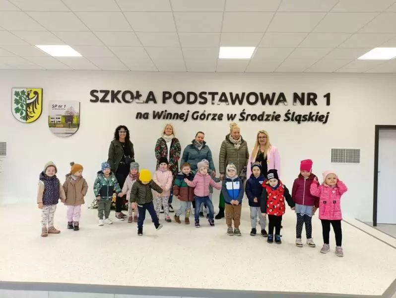 Dzisiejszy poranek spędziliśmy bardzo przyjemnie. Dzieci z grupy Myszki z Przedszkola Publicznego nr 1 w Środzie Śląskiej odwiedziły nową Szkołę Podstawową nr 1 na Winnej Górze.