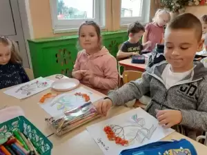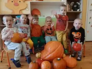 W każdej grupie odbyły się dyniowe zabawy: klasyfikowanie dyń według wielkości, koloru i kształtu, szeregowanie od największej dyni do najmniejszej, przeliczanie dyń i wiele innych ciekawych i pouczających zabaw. Powstała nawet naturalna ciastolina, w kolorze dyni oczywiście.