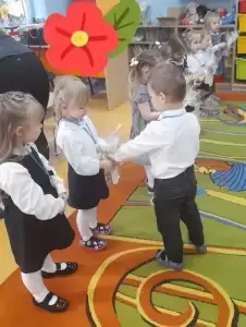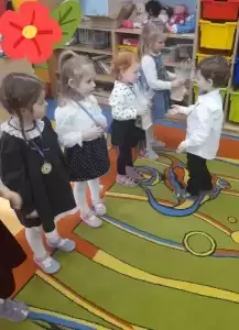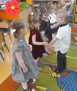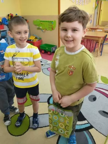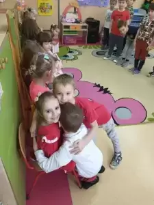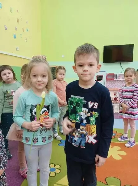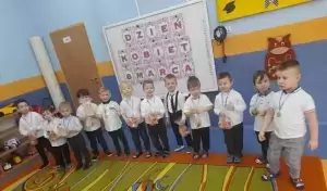 Chłopcy złożyli życzenia, tradycyjnie zaśpiewali swoim koleżankom uroczyste „100 lat”. Następnie wręczyli piękne laurki i niespodzianki. Chłopcy ze szczególnym zaangażowaniem starali się, aby ten dzień uczynić wyjątkowo miłym. Jako mali dżentelmeni wyręczali dziewczynki w codziennych obowiązkach między innymi w porządkowaniu sali po zabawie. Było można usłyszeć taneczną muzykę, w rytm której bawiły się zarówno dziewczynki jak i chłopcy. Wiele radości sprawiły dzieciom przygotowane z tej okazji zabawy i konkurencje. Uśmiechnięte buzie przedszkolaków, a zwłaszcza dziewczynek świadczyły o mile spędzonym czasie.
