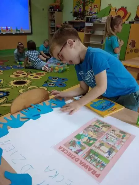 W związku z tym jak co roku w naszym przedszkolu obchodziliśmy Międzynarodowy Dzień Praw Dziecka. We wszystkich grupach zostały podjęte różnorodne działania. Przedszkolaki oglądały prezentację multimedialną pt. ,,Prawa dziecka – Twoje prawa”, poznały „Konwencję o Prawach Dziecka” i wypowiadały się na temat swoich praw. Przedszkolaki tańczyły przy piosence ,,Wszystkie dzieci nasze są”, odbijały umoczone w farbie dłonie na kartce z prawami dziecka, kolorowały obrazki przedstawiające dzieci z różnych stron świata, wykonywały plakat na temat ,,Praw dziecka”. Poprzez wyżej wspomniane działania przedszkolaki poznały przysługujące im prawa, a także obowiązki dorosłych wobec nich.