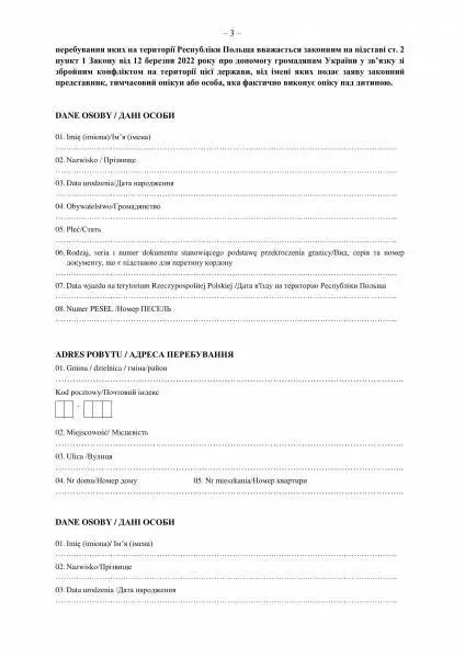 Громадянин України, перебування якого на території Республіки Польща вважається законним, тобто який законно в’їхав на територію Республіки Польща безпосередньо з території України в період з 24 лютого 2022 року, заявляє про намір залишитися. на території Республіки Польща та внесена до реєстру PESEL допомога у вигляді одноразової грошової допомоги у розмірі 300 злотих на особу на утримання, зокрема на покриття витрат на харчування, одяг, взуття, засоби особистої гігієни та плата за житло.