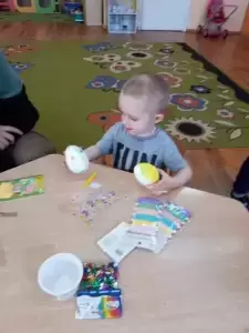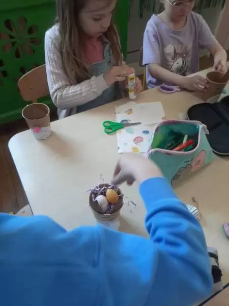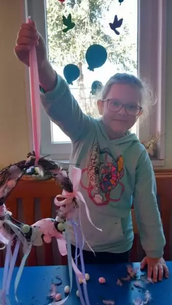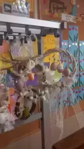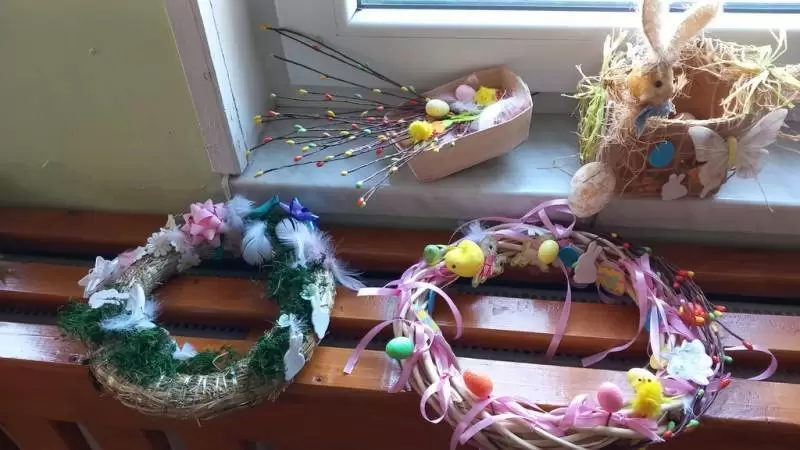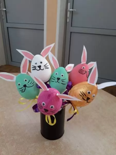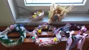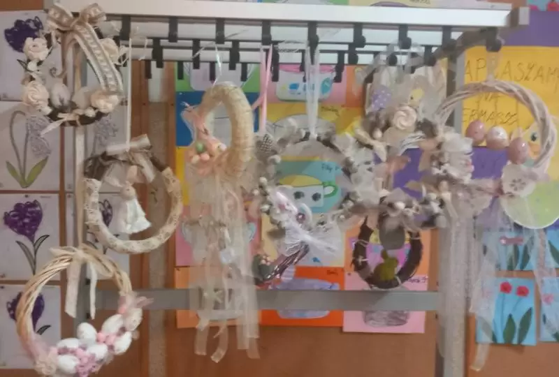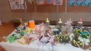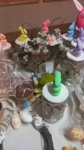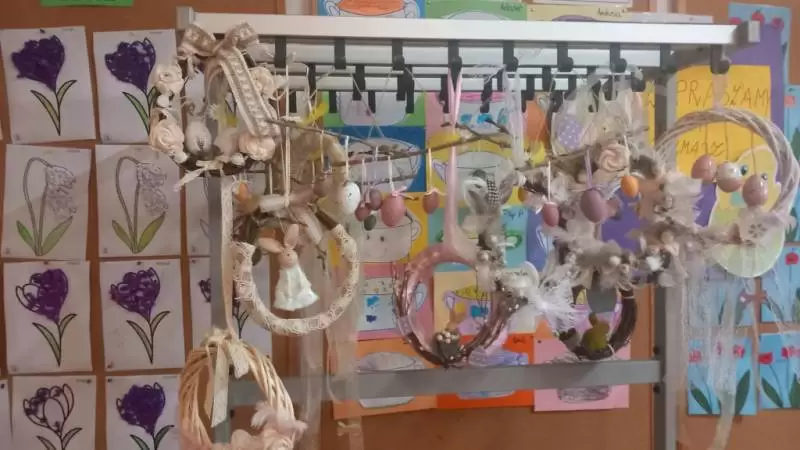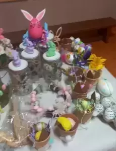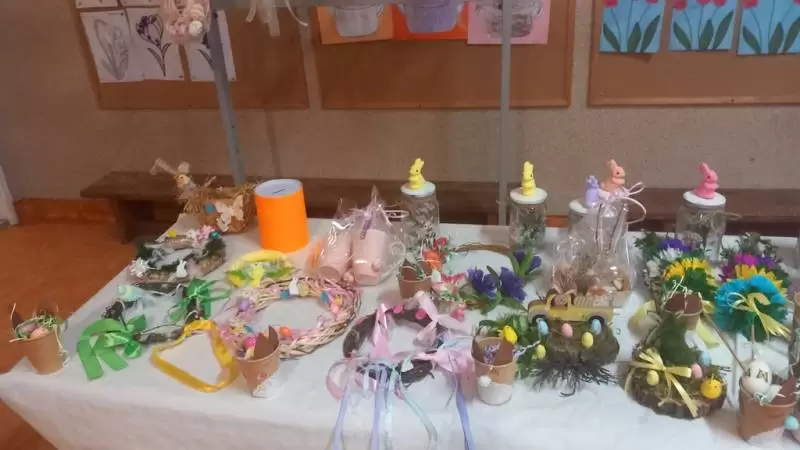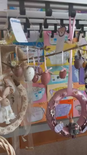 Wśród kolorowych dekoracji, którymi autorami byli wszyscy – Dzieci, Rodzice, Nauczyciele, można było kupić wiosenno-wielkanocne wianki, stroiki, kolorowe pisanki, ręcznie robione mydełka, figurki gipsowe, wiszące dekoracje z pisanek, ozdobne słoiki z zajączkiem oraz wiele innych świątecznych drobiazgów.