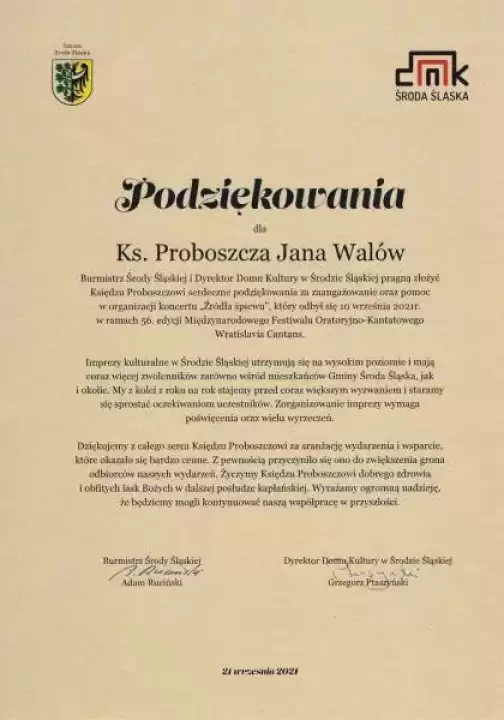 Komunikat UM Środa Śląska dot. podziękowań dla ks. proboszcza Jana Walów
