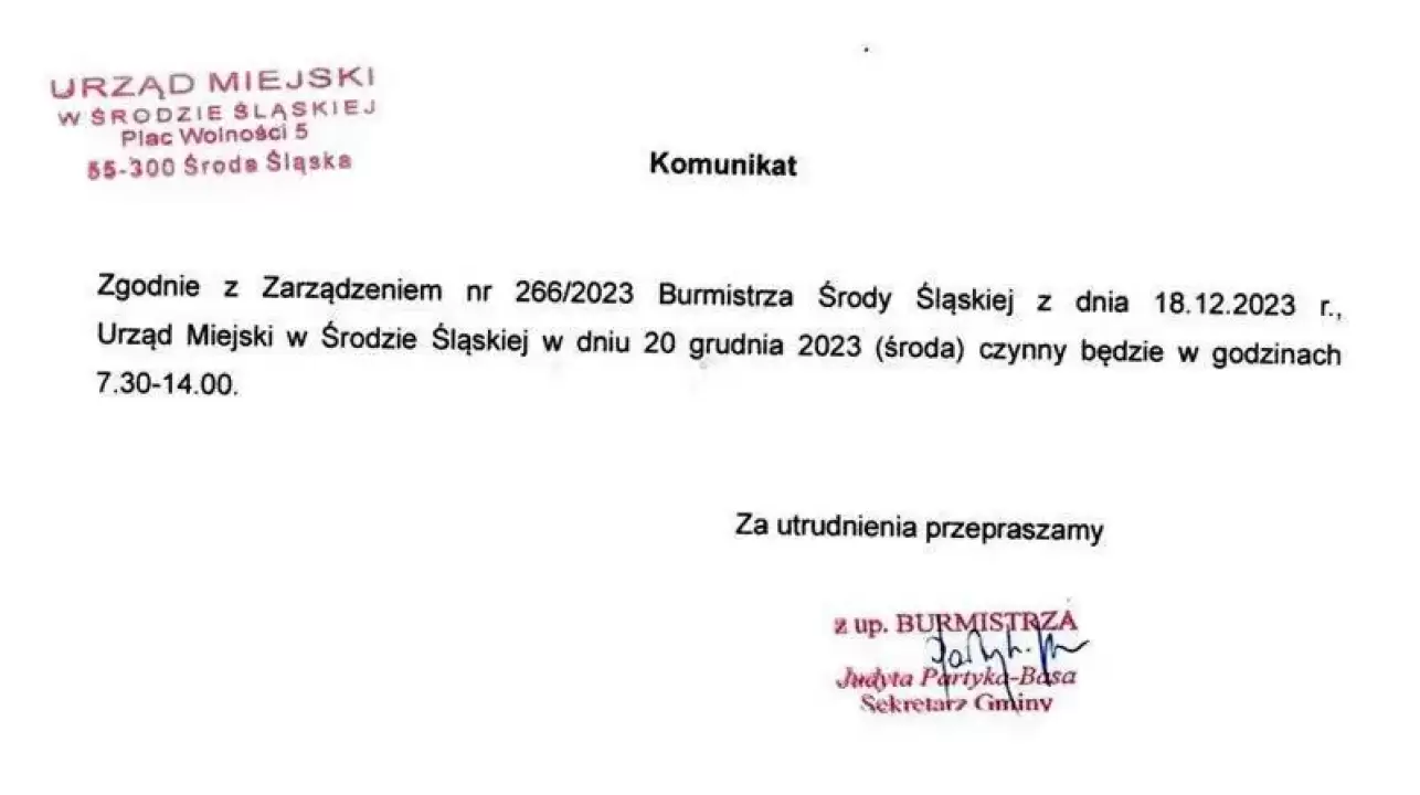 Komunikat Urzędu Miejskiego w Środzie Śląskiej