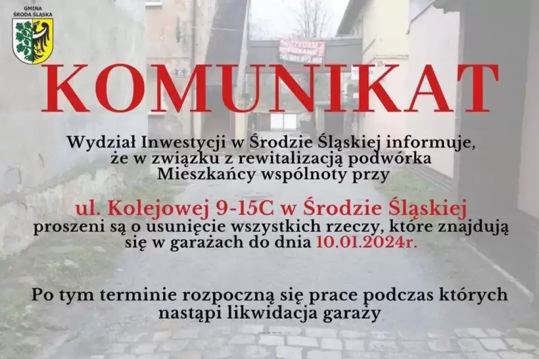 W związku z rewitalizacją podwórka przy ul. Kolejowej, Wydział Inwestycji Urzędu Miejskiego w Środzie Śląskiej prosi Mieszkańców wspólnoty o usunięcie wszystkich rzeczy, które znajdują się w garażach.