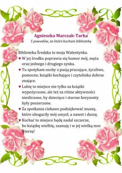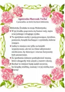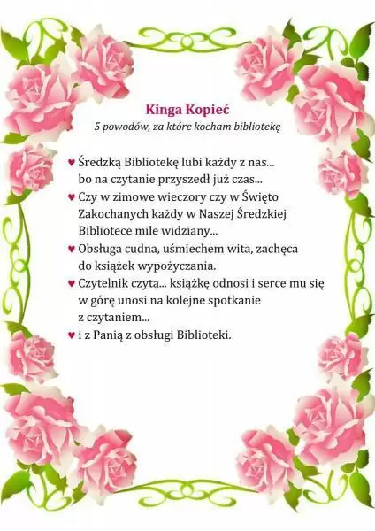 Pracownicy Biblioteki Publicznej w Środzie Śląskiej w przekonaniu, że miłością można darzyć również książki i bibliotekę, dlatego z okazji walentynek przygotowali konkurs literacki pt. „5 powodów, za które kocham bibliotekę”.