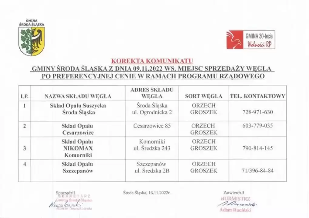 Korekta komunikatu Gminy Środa Śląska ws. miejsc sprzedaży węgla po preferencyjnej cenie