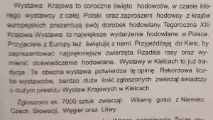 Tegoroczna wystawa odbyła się w dniach 14-15 grudnia. Zaprezentowano na niej gołębie o najróżniejszych rasach, wzorach i kolorach. - W wystawie "mojej" rasy udział brało 8 hodowców z całej Polski, którzy wystawili łącznie 85 gołębi i spośród nich mój uzyskał najwyższą ocenę, bo 97 pkt. Żeby zostać mistrzem Polski, trzeba mieć 4 najwyżej ocenione ptaki - wyjaśnia Michał Kozak.