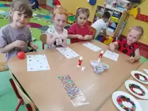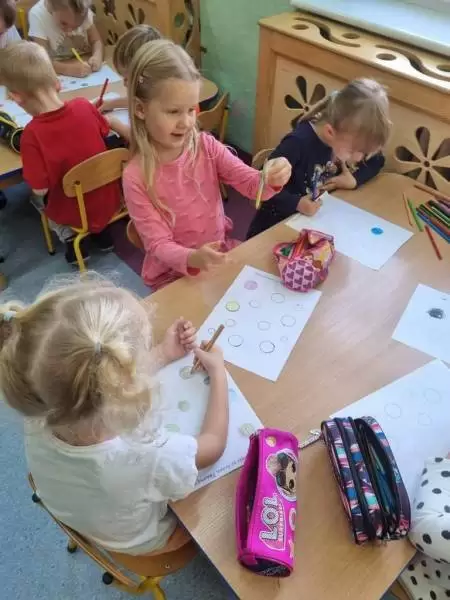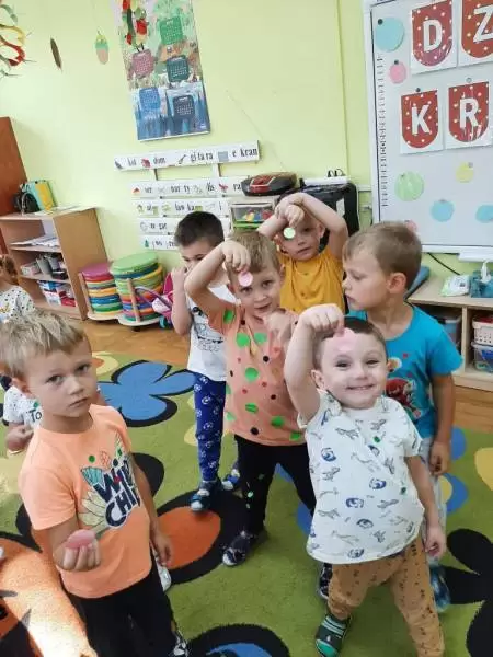 Tego dnia również dostrzegaliśmy kropki tam, gdzie wcześniej nikt na nie nie zwracał uwagi. Okazało się, że kropki towarzyszą nam w naszym codziennym życiu: są w kropkach biedronki, z kropki można utworzyć słońce, bombkę choinkową, kolorową kulę czy piłkę.