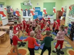 Dzieci nadsłuchiwały dźwięku dzwoneczków, które słychać było już z daleka, co świadczyło o tym, że zbliża się nikt inny jak Święty Mikołaj. Przedszkolaki były bardzo szczęśliwe, rozpromienione, a kiedy znalazły się blisko Świętego Mikołaja – troszkę zawstydzone.