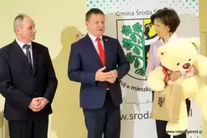 Pani minister odwiedzając grupę Żabek obdarowała pociechy pluszakami. W podziękowaniu za złożenie wizyty w średzkiej placówce minister Marlena Maląg otrzymała z rąk dyrektora placówki wielkiego misia.