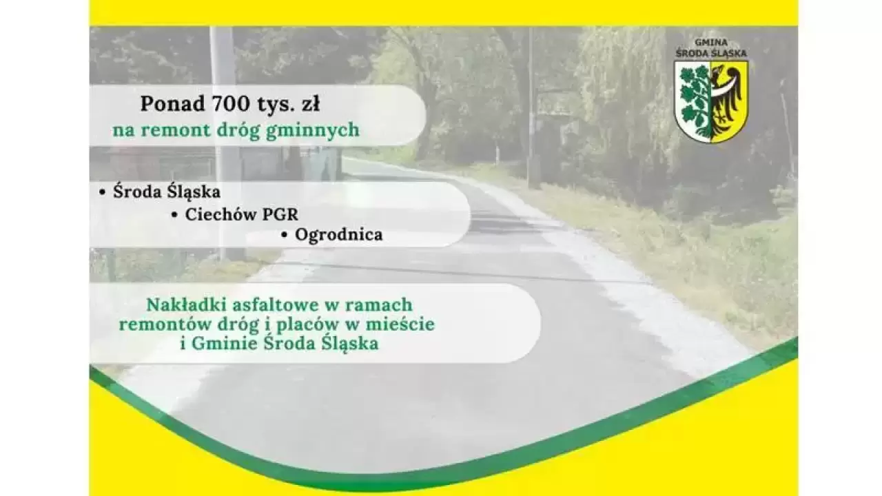 Wykonano m.in. remont nawierzchni drogi gminnej w miejscowości Ogrodnica o powierzchni około 2310 m2 wraz ze zjazdami, remont nawierzchni drogi gminnej w miejscowości Ciechów – PGR o powierzchni 361,00 m2, a także wyremontowano nawierzchnię drogi przy ul. 1-go Maja w Środzie Śląskiej o powierzchni 203,00 m2.