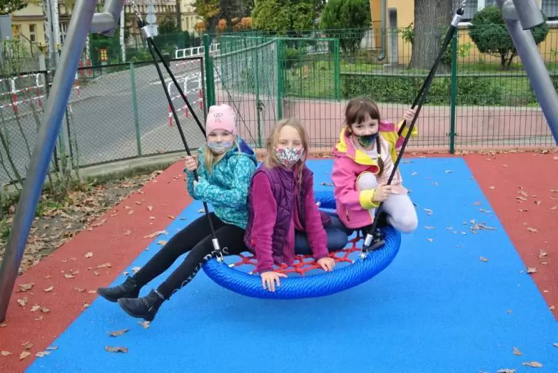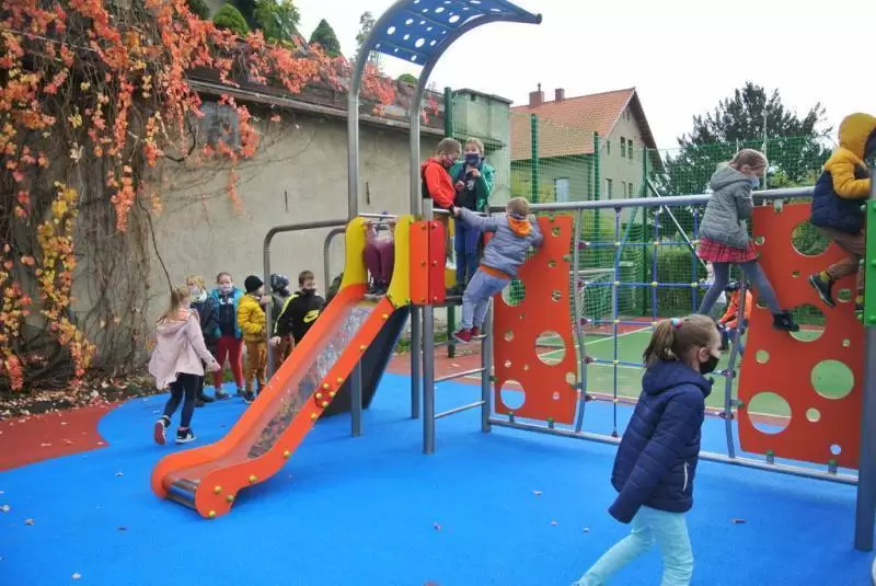 Rok temu przy świetlicy szkoły przy ul. Górnej oddano do użytku poliuretanowe boisko do gry w piłkę nożną. Od wczoraj dzieci mogą też korzystać z nowoczesnego, bezpiecznego placu zabaw, w skład którego wchodzą m. in. huśtawki, ścianki wspinaczkowe, drabinki, zjeżdżalnia i trampolina. Jest on również cały pokryty nawierzchnią poliuretanową.