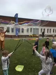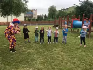 Był to dzień pełen atrakcji i wrażeń. Przedszkolaki ochoczo bawiły się na dmuchanym placu zabaw i zjeżdżalni, uczestniczyły w zabawach i tańcach animacyjnych oraz malowaniu twarzy. Atrakcyjną zabawą okazało się samodzielne robienie dużych rozmiarów baniek mydlanych. Wielką niespodzianką dla dzieci okazała się również „żywa” maskotka Minionka, z którą przedszkolaki chętnie się witały i przybijały „piątki”.