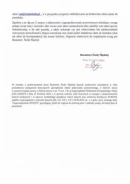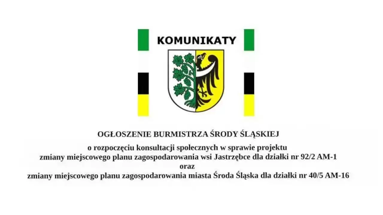 Ogłoszenie Burmistrza Środy Śląskiej o rozpoczęciu konsultacji społecznych w sprawie projektu zmiany miejscowego planu zagospodarowania wsi Jastrzębce dla działki nr 92/2AM-1 oraz zmiany miejscowego planu zagospodarowania miasta Środa Śląska dla działki nr 40/5 AM-16.