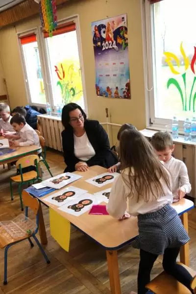 Naszych gości powitały dzieci z grupy "Zuchów" śpiewając i tańcząc do piosenki matematycznej. Każdy trzyosobowy zespół miał do rozwiązania 8 zadań matematycznych, przygotowanych przez Panią Arletę Rajczakowską - pomysłodawcę olimpiady. Były to zadania takie, jak: przeliczanie, porównywanie liczb, rytmy, kodowanie, pamięć wzrokowa, koordynacja itd.