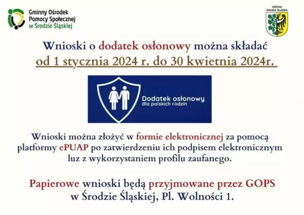 Gminny Ośrodek Pomocy Społecznej w Środzie Śląskiej informuje, że w dniu 18.01.2024 r. ogłoszono Rozporządzenie Ministra Klimatu i Środowiska z dnia 16 stycznia 2024 r. zmieniające rozporządzenie w sprawie wzoru wniosku o wypłatę dodatku osłonowego (Dz. U. 2024 r. poz. 59).