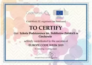 Szkoła w Ciechowie jako pierwsza w powiecie wprowadza nowoczesne rozwiązanie, jakim jest legitymacja w smartfonie ucznia. W ramach deklarowanego udziału w tygodniu kodowania uczniowie koła matematycznego wraz z opiekunem przeprowadzili również działania wraz z akcją „CodeWeek2019 ” w terminie 7 – 11 października. CodeWeek to organizowana na terenie całej Europy, społeczna inicjatywa, dedykowana wszystkim, którzy chcą rozpocząć lub kontynuować przygodę z programowaniem. Stało się to świetną okazją, by zacząć zabawę z grami logicznymi i kodowaniem.