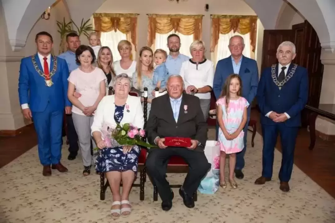 Małżeństwu ze Środy Śląskiej podczas uroczystego przekazania odznaczeń towarzyszyła najbliższa rodzina, dzieci oraz wnuki. Wszyscy razem świętowali tak piękny jubileusz.