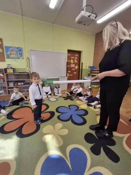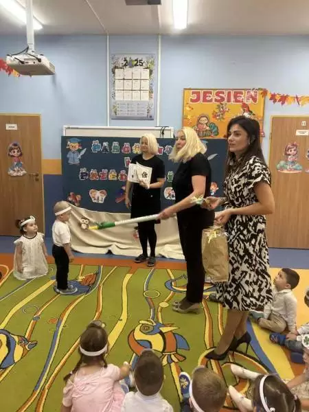 Uroczystość rozpoczęła się od wesołych występów artystycznych. Dzieci śpiewały piosenki, recytowały wierszyki i tańczyły. Najważniejszym punktem programu było oczywiście pasowanie. Pani Dyrektor dużą, kolorową kredką dotykała ramienia każdego dziecka, ogłaszając je pełnoprawnym przedszkolakiem. To symboliczny, ale niezwykle radosny moment, który na długo pozostanie w pamięci najmłodszych.