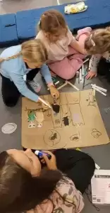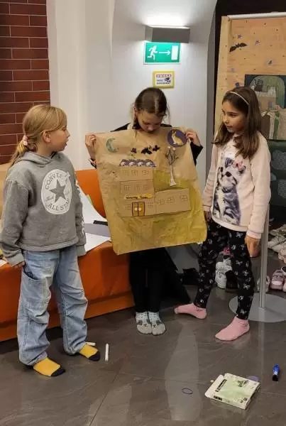 Następnym punktem Nocy Bibliotek były twórcze warsztaty z Panią Ewą Martynkien, autorką książek dla dzieci, scenarzystką seriali i programów dla najmłodszych. Uczestnicy tworzyli swoje własne scenariusze na podstawie, których powstawały kreatywne prace i opowiadania.
