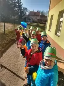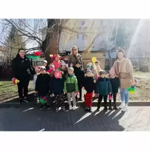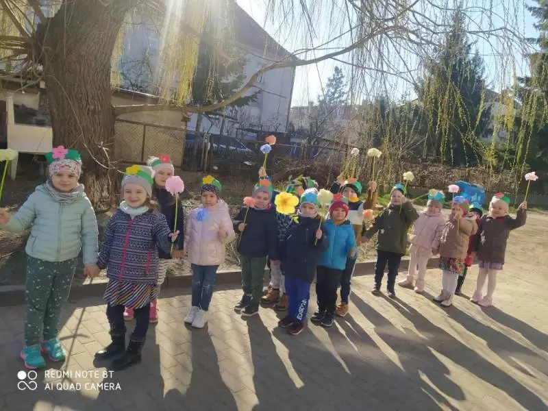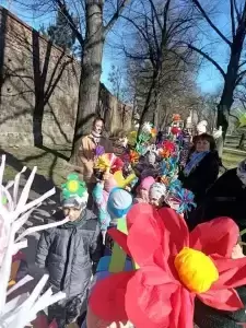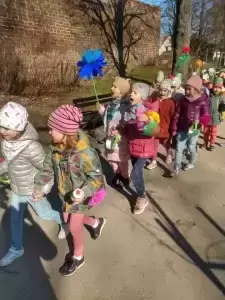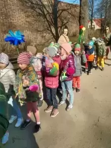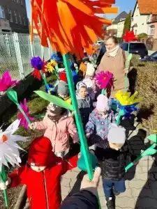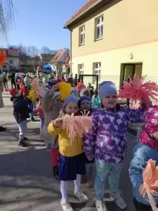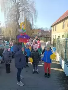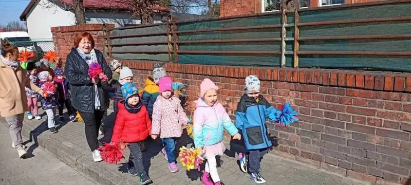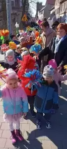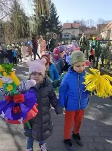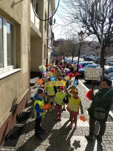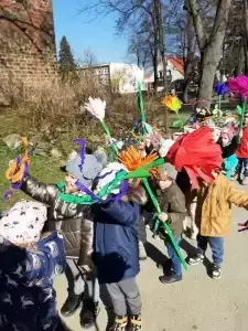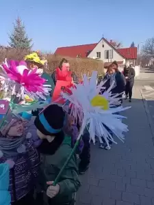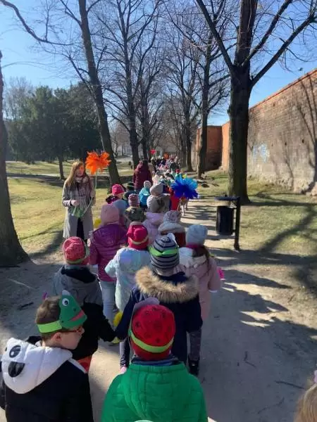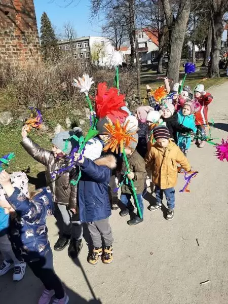 Mimo wielu atrakcji najbardziej oczekiwaną częścią dnia było wyjście na spacer, podczas którego mogliśmy pożegnać zimę i powitać wiosnę. Dzieci radośnie maszerowały w wiosennym korowodzie z kwiatami, przemaszerowały ulicami naszego miasta skandując hasła: „Wiosno przyjdź - Zimo odejdź". Wszędzie wkoło zrobiło się zielono, a słońce zaczęło świecić mocniej. Bardzo się cieszymy, że Wiosnę powitaliśmy. Mamy nadzieję, że Zimę zobaczymy dopiero za rok.
