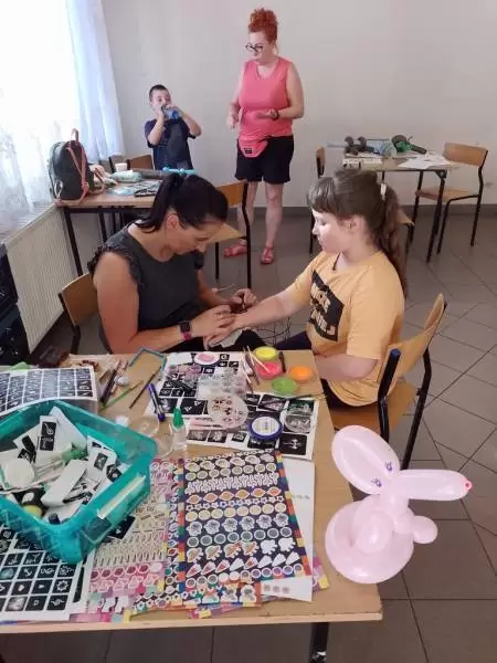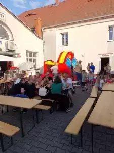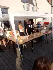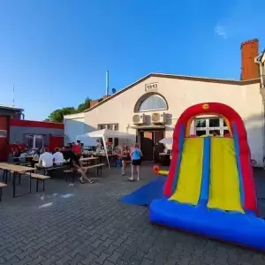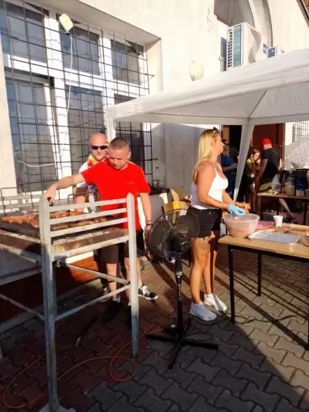 Pogoda dopisała, więc na terenie przed salą zorganizowany był poczęstunek, gdzie można było znaleźć potrawy z grilla, swojski chlebek ze smalcem, watę cukrową, popcorn, mrożoną kawę, a w środku na sali szwedzki stół, gdzie znajdowały się domowe ciasta, owoce, soki, napoje...