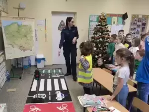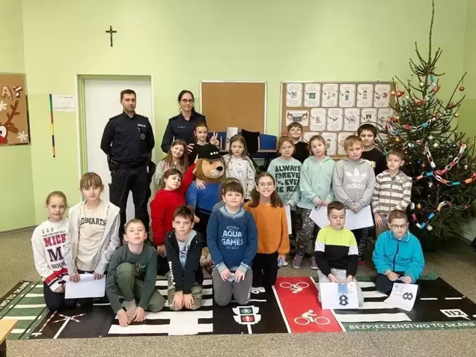 W kolejnych działaniach informacyjno-edukacyjnych wzięli udział uczniowie Szkoły Podstawowej w Ciechowie, którzy pod okiem dzielnicowych z Komendy Powiatowej Policji w Środzie Śląskiej zapoznawali się z zasadami bezpiecznego przechodzenia przez jezdnię, właściwego poruszania się po drodze, w tym drodze dla rowerów. Policjanci omówili zasady obowiązujące przy przechodzeniu przez przejazdy kolejowe oraz wybrane znaki drogowe. Aby łatwiej było Naszym Skarbom zrozumieć przekazywane im informacje, policjanci korzystali z pozyskanych w ramach programu materiałów edukacyjnych takich, jak mata z przejściem dla pieszych i torami kolejowymi, znaki drogowe oraz sygnalizator świetlny.