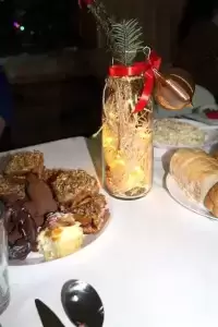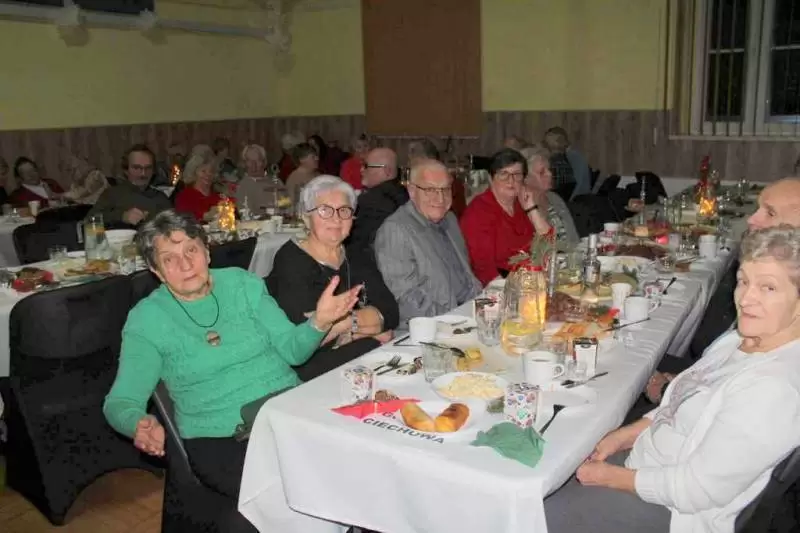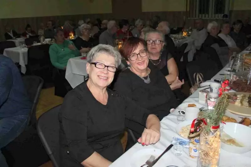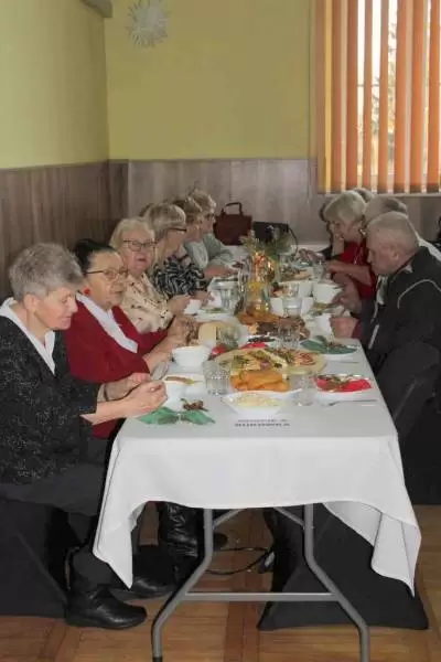 Uczestnicy degustowali pyszny barszcz z uszkami, pierogi z kapustą, fantastyczną rybkę, sałatkę jarzynową i krokiety. Na stole były piękne, świąteczne kompozycje w postaci jadalnych choinek. Każdy mógł napić się grzanego wina lub piwa z korzennymi przyprawami. Całość uświetniły występy wokalne dziewczynek – Zosi Piotrowskiej, Emilii Nadbrzeskiej, Oli Mazur, Hani Pasierbek i Justyny Dyndy. Gwiazdą wieczoru była Oliwia Bachowska, która zaśpiewała śliczne pastorałki i kolędy. Występujący otrzymali gromkie brawa. Na zakończenie do spotkania dołączył Święty Mikołaj i obdarował gości drobnymi podarunkami. Uśmiech radości pojawił się na wszystkich twarzach.