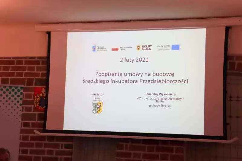 2 lutego w sali sesyjnej Rady Miejskiej w Środzie Śląskiej burmistrz Adam Ruciński i skarbnik Radosław Śliwa podpisali z właścicielami lokalnej firmy budowlanej KIZ s.c. Krzysztofem Staśko i Aleksandrem Staśko kontrakt na budowę Średzkiego Inkubatora Przedsiębiorczości (ŚIP) ze środków Unii Europejskiej.