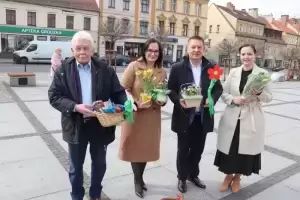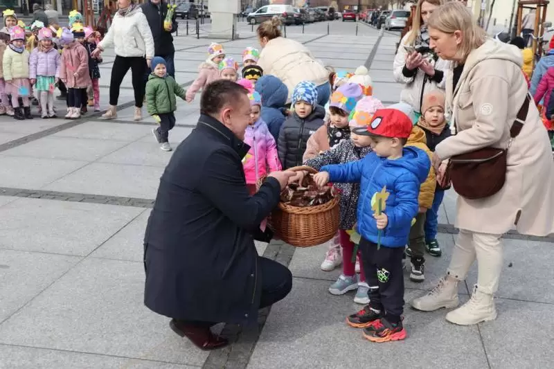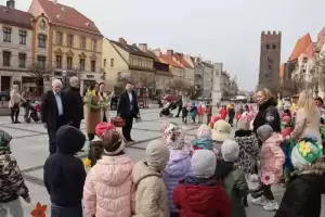 Dzieci z Przedszkola nr 3 „Pod Topolą” wraz z dyrektor Aleksandrą Karcz-Cieślą i wychowawcami przywitały się po czym odśpiewali piosenki przywołujące wiosnę. Wręczyły też włodarzowi kwiaty symbolizujące początek kalendarzowej wiosny.