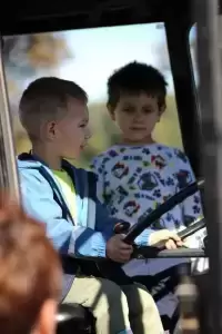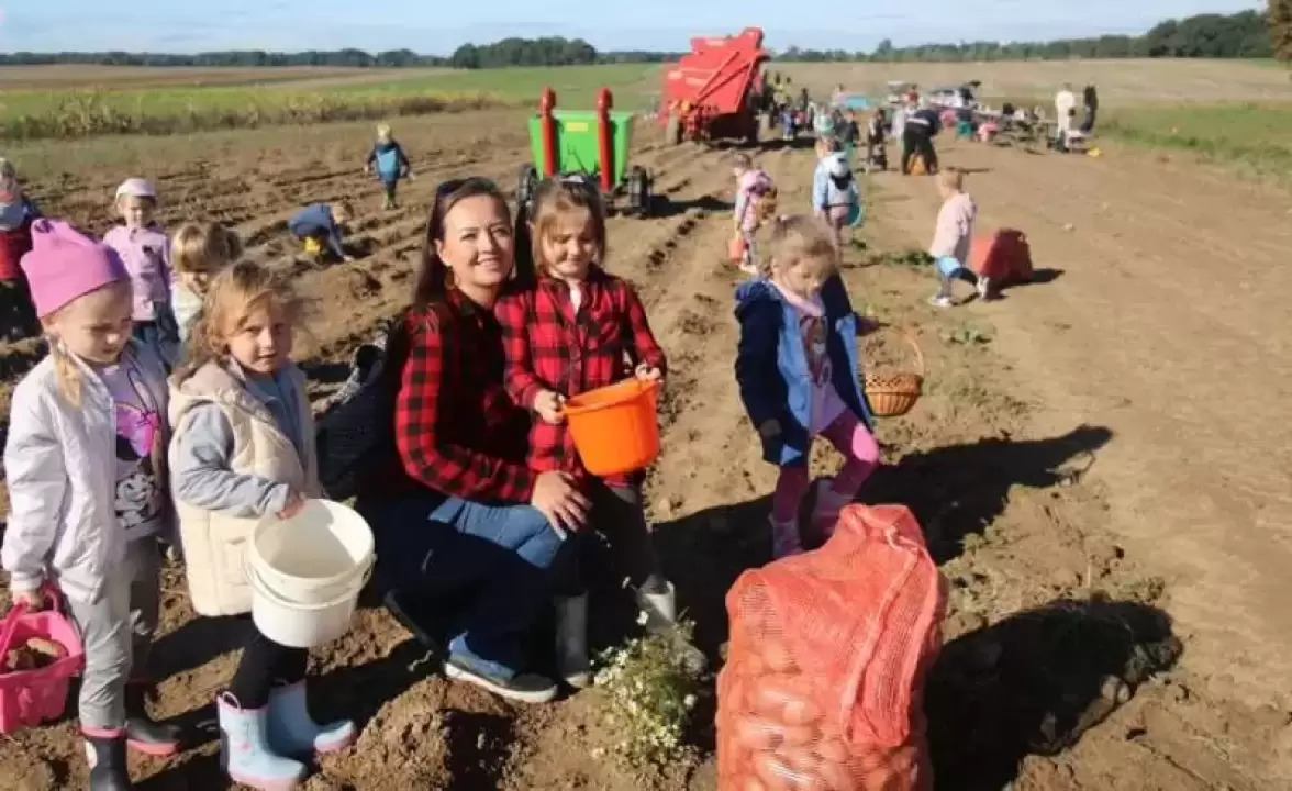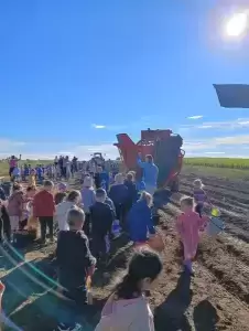 Państwo Szafran zaprosili wszystkie dzieci na swoje pole, aby zobaczyły jaki sprzęt służy do wykopywania ziemniaków oraz jak wygląda cały proces zbierania ich. Miały również okazję własnoręcznie zbierać ziemniaki z pola do worków i na przyczepę.
