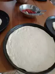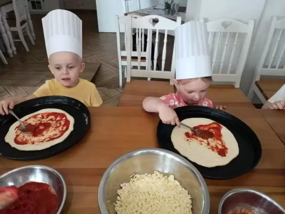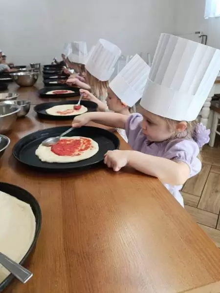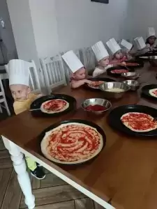 Po krótkim instruktażu przedszkolaki zabrały się do robienia swoich własnych pizz. Pod bacznym okiem pracowników dzieci formowały ciasto, smarowały je sosem, następnie komponowały dodatki według własnego smaku a na koniec posypywały serem. Przedszkolaki bardzo poważnie potraktowały zadanie i z wielkim skupieniem wykonywały swoją pracę.