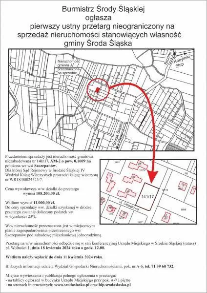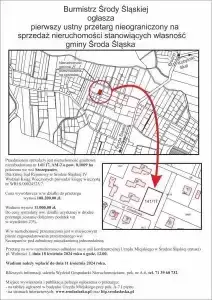 Burmistrz Środy Śląskiej ogłasza pierwszy ustny przetarg nieograniczony na sprzedaż nieruchomości stanowiących własność gminy Środa Śląska.