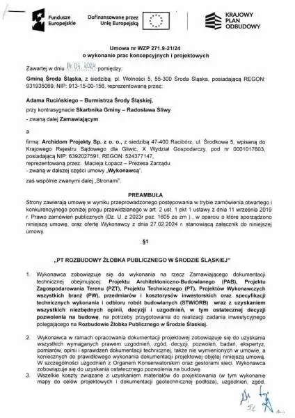 14 marca burmistrz Adam Ruciński podpisał umowę z firmą Archidom Projekty Sp. z o.o. z Raciborza na wykonanie projektu technicznego rozbudowy żłobka publicznego w Środzie Śląskiej. W pierwszym etapie zostanie opracowany kompletny projekt architektoniczno – budowlany oraz projekt zagospodarowania terenu wraz z uzyskaniem wszelkich niezbędnych uzgodnień, opinii i decyzji, natomiast w etapie drugim planowane jest uzyskanie prawomocnej decyzji pozwolenia na budowę. Wartości dokumentacji technicznej wynosi blisko 66 tys. zł.