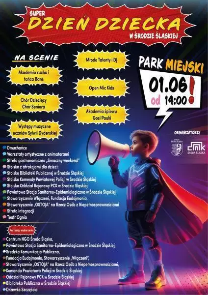 1 czerwca 2025 r. o godzinie 14:00 w Parku Miejskim w Środzie Śląskiej odbędzie się wyjątkowe świętowanie Dnia Dziecka. To dzień pełen radości, śmiechu i niezapomnianych przeżyć dla najmłodszych mieszkańców oraz ich rodzin.