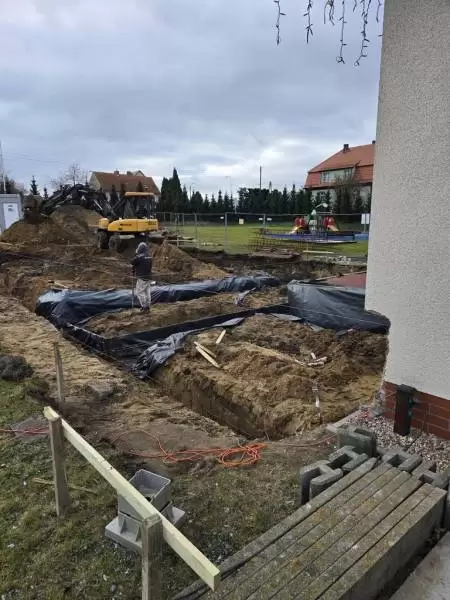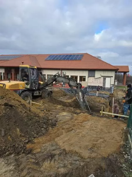 Dotychczas wykonano część prac w zakresie przebudowy (wyburzenia, postawiono ścianki działowe, instalacje w sanitariatach i przygotowano podłoża pod montaż okładzin) i wyznaczono geodezyjnie lokalizację dodatkowego budynku oraz usunięto warstwę humusu w miejscu jego posadowienia.